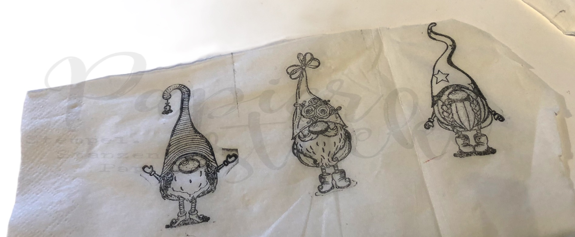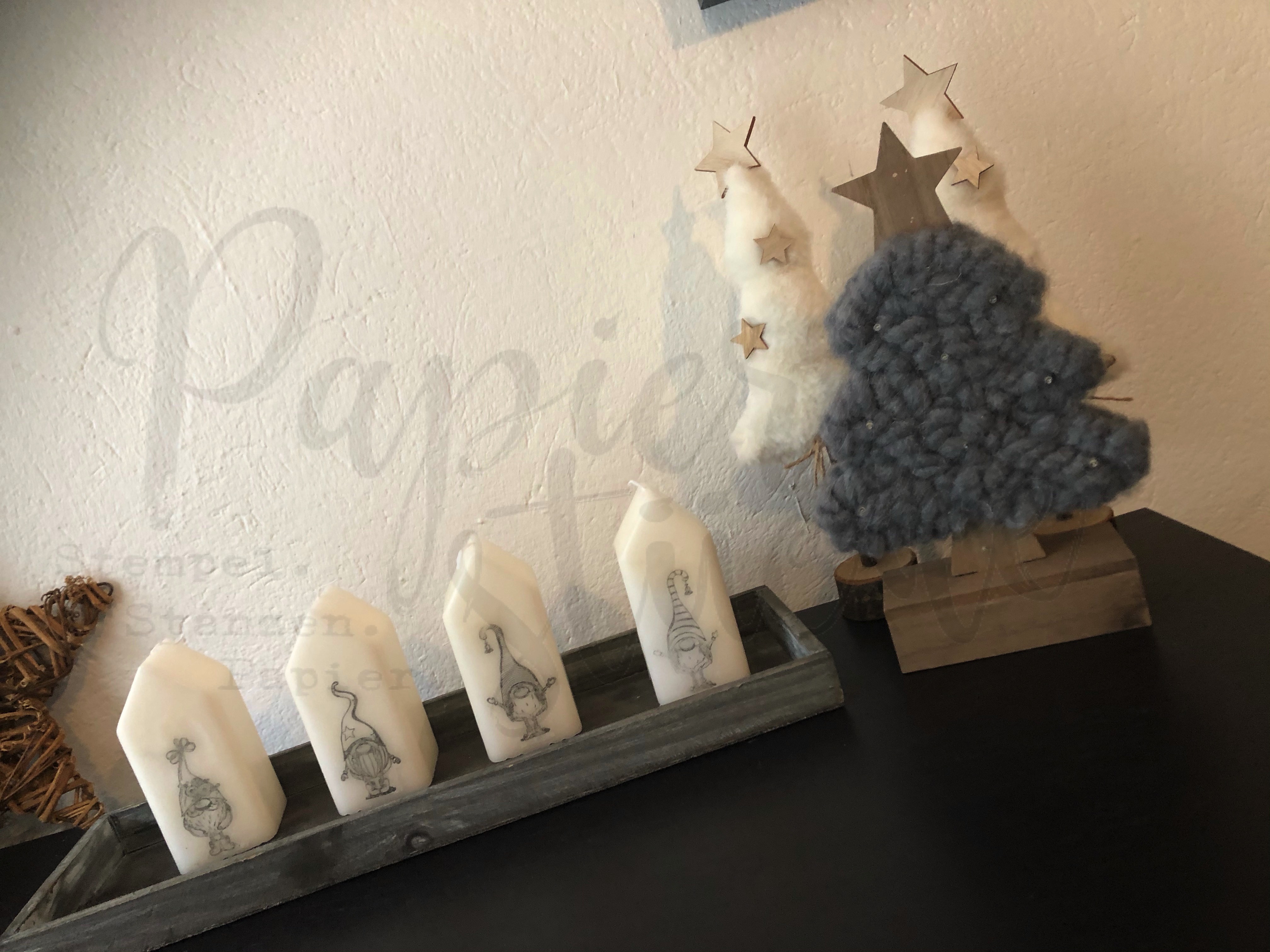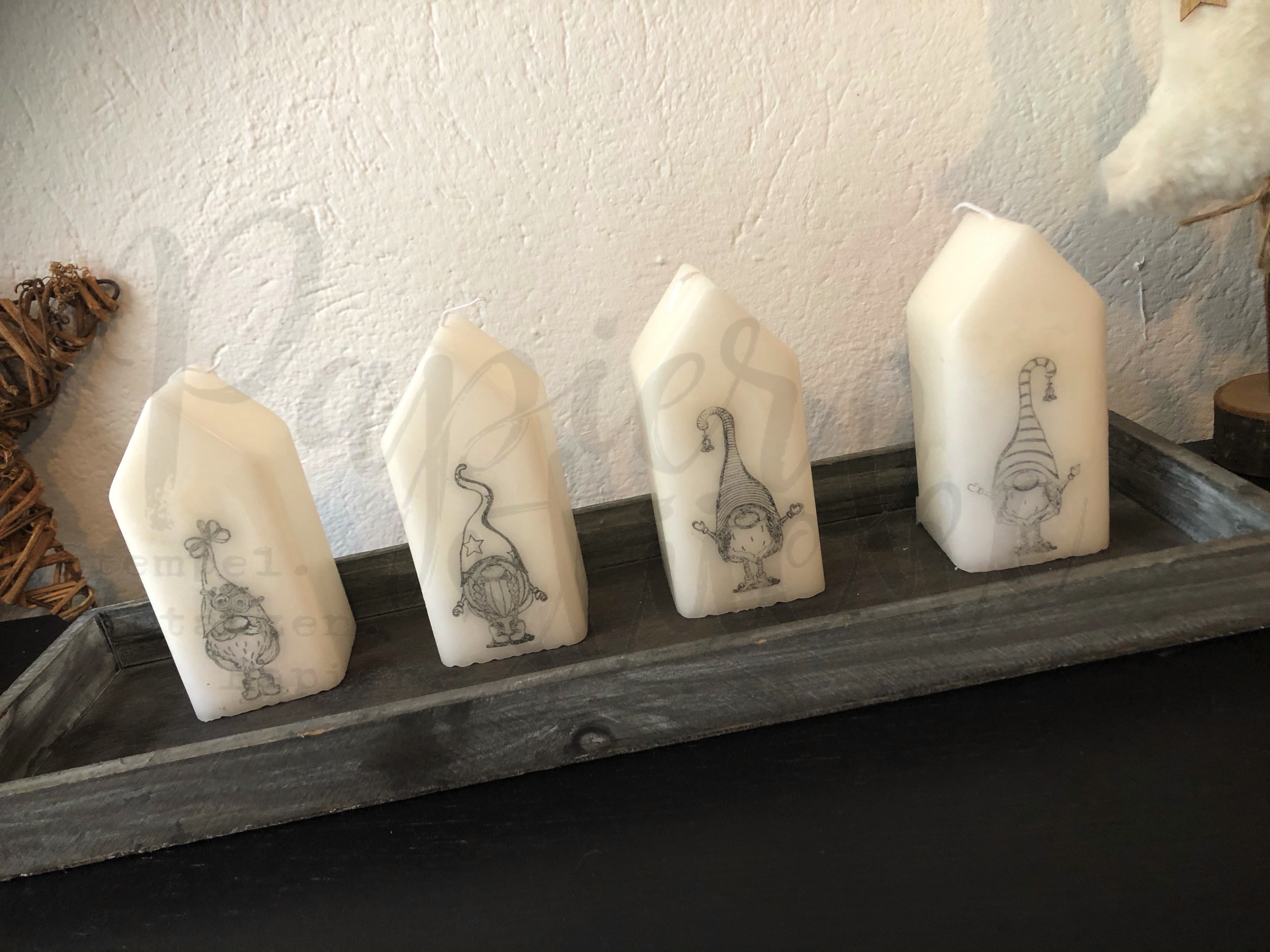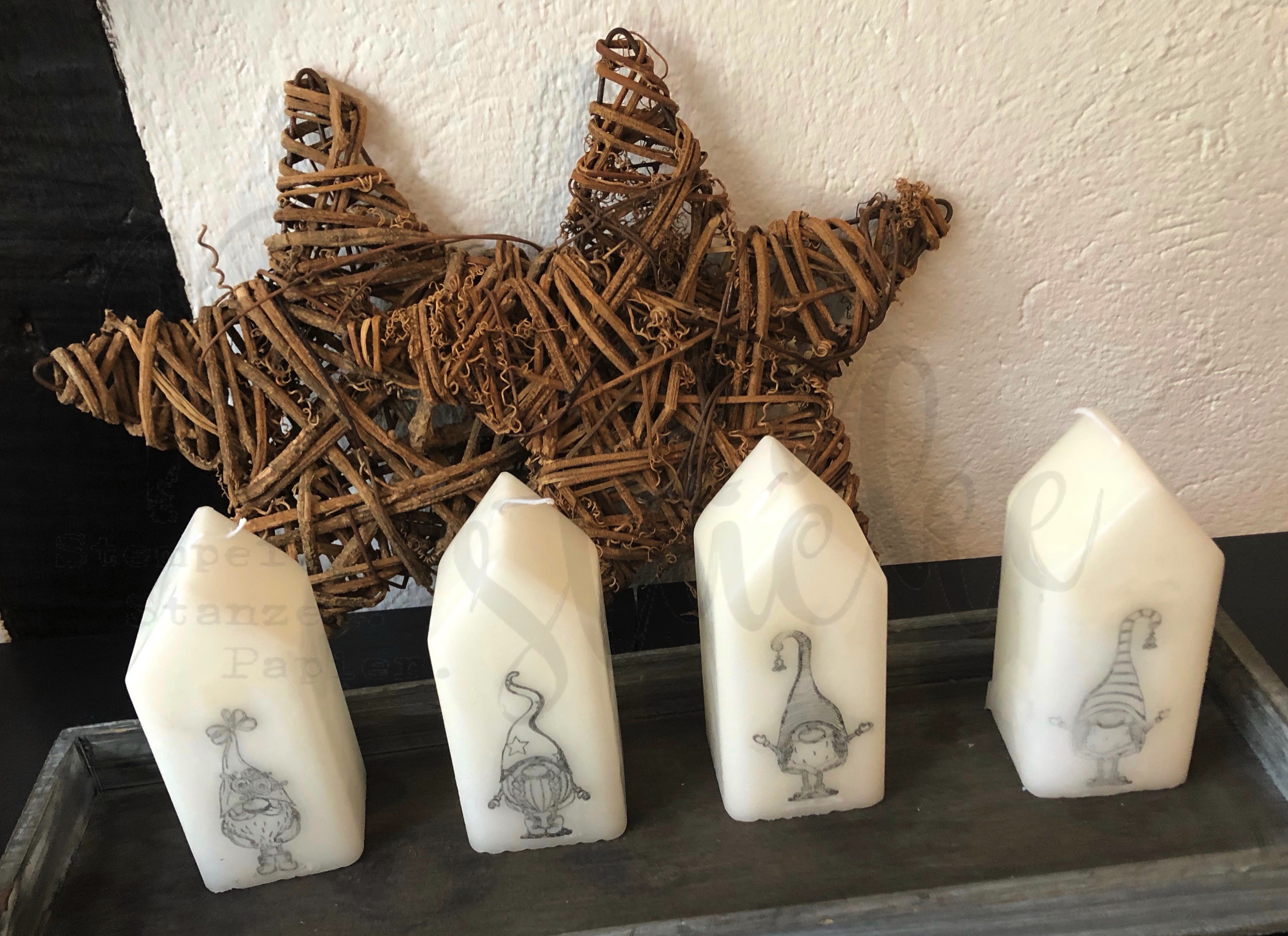 Immerhin war unsere diesjährige Weihnachtsdeko Grund genug, ein paar neue Wichtelstempel zu entwerfen. Und weil es gerade überall zu sehen ist, habe ich auch mal ein paar Kerzen bestempelt (Lemming… ihr kennt das 🤣). Kerzen stempeln ist wirklich super einfach und geht echt fix – und das Beste ist: Nahezu aus Bordmitteln zu verwirklichen. Denn weiße Servietten, Backpapier und einen Embossing- und/oder normalen Fön hat sicherlich jede/r von uns im Hause. Also einfach die Serviette genommen, die süßen Gnomies (klick) aufgestempelt (ich hab einfach das schwarze Nuvo Inkpad (klick)verwendet) und die oberste Lage der Serviette auf einer Kerze platziert. Danach mit Backpapier straff umwickelt (am besten mit Klebefilm auf der Rückseite fixieren) und kurz angefönt, bis das Wachs unter dem Backpapier leicht zu schmelzen beginnt. Dann einfach noch mal glatt streichen und et voila… das Motiv ist auf der Kerze und von der Serviettenschicht nichts mehr zu sehen. 😊